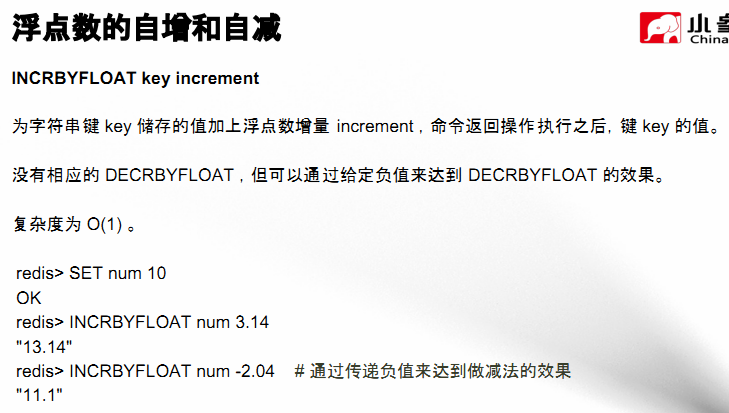同decr,减指定值。decrby完全是为了可读性,我们完全可以通过incrby一个负值来实现同样效果,反之一样。