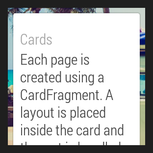 举个例子,Android SDK内的GridViewPager例子中包含了下面的adapter实现,该实现提供一组静态的具有自定义背景图片的card: