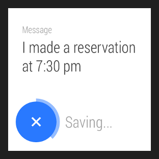 Android Wear应用中的确认界面(Confirmations)通常是全屏或者相比于手持应用占更大的部分。这样确保用户可以一眼看到确认界面(confirmations)且有一个足够大的触摸区域用于取消一个操作。