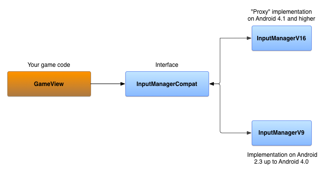 我们现在已经有两个 InputManagerCompat 的实现:一个可以在运行 Android 4.1 或者更高版本的设备上工作,另一个可以在运行 Android 2.3 到 Android 4.0 的设备上工作。