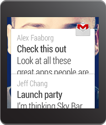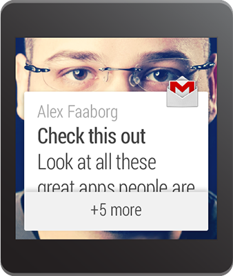 尽管如此,一个概括式的Notification在可穿戴设备上并不是很有用处,因为用户不能在可穿戴设备上阅读每条消息的详细内容(他们必须在手持式设备上打开相应的app才能看到更多信息)。所以对可穿戴设备而言,开发者应该将所有的Notification都集中起来,放成一叠。这叠Notification以一张卡片的形式显示出来,用户可以将它展开,分别看到每个Notification的详细内容。通过新方法setGroup()能够实现该功能,同时,也能保持手持式设备上显示为一条概括式的Notification。