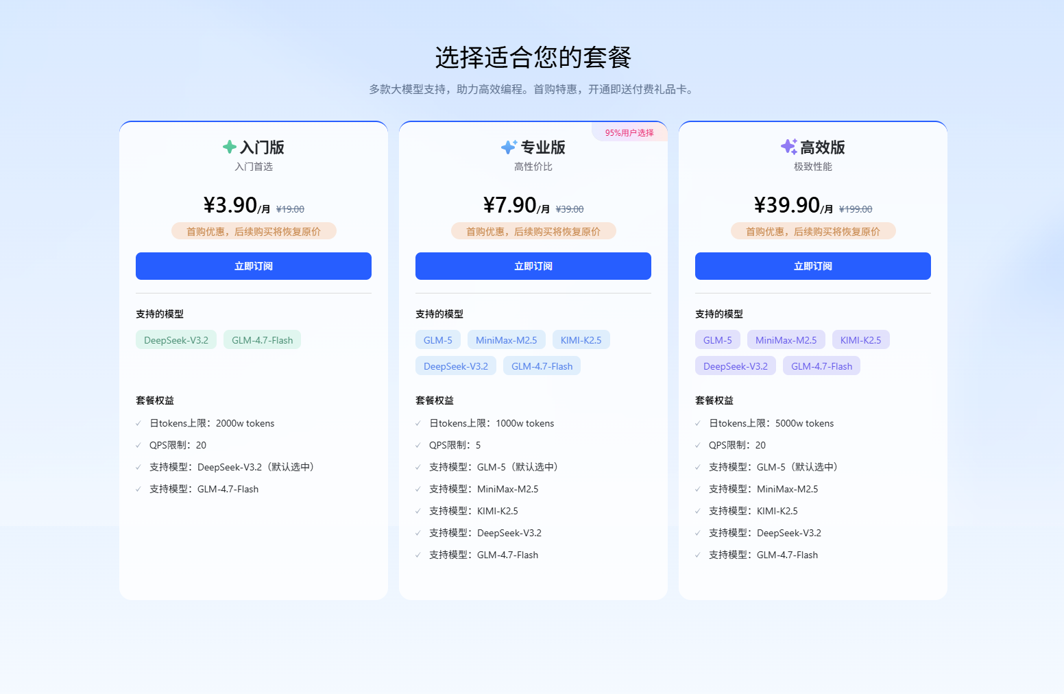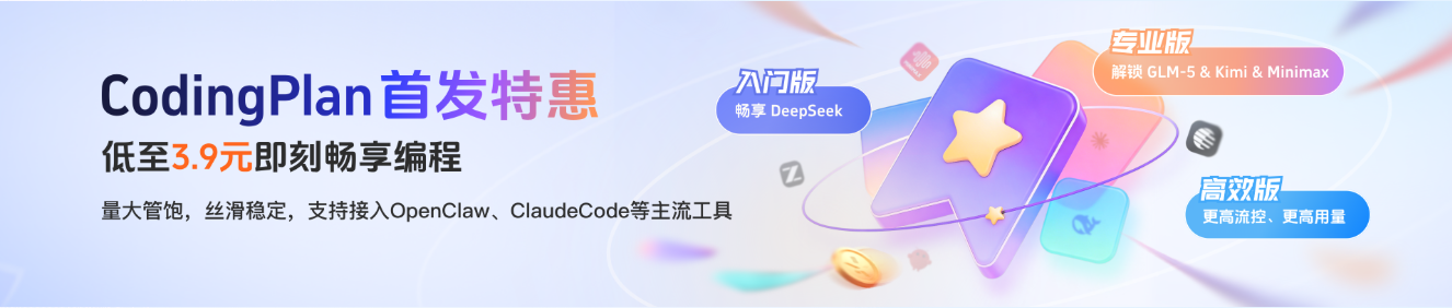 这个套餐整合了 GLM-5、MiniMax-M2.5、Kimi-K2.5、DeepSeek-V3.2、GLM-4.7-Flash 五大顶流开源模型,兼容 OpenClaw、Claude Code、Cursor 等主流 AI 编程工具,你不需要改变自己的开发流程和习惯,就能直接在常用工具里接入使用,根据不同的开发需求自由切换模型:写复杂算法用推理能力强的 GLM-5,代码补全和解释用专门优化的 Kimi-K2.5,彻底摆脱单一模型的功能局限。