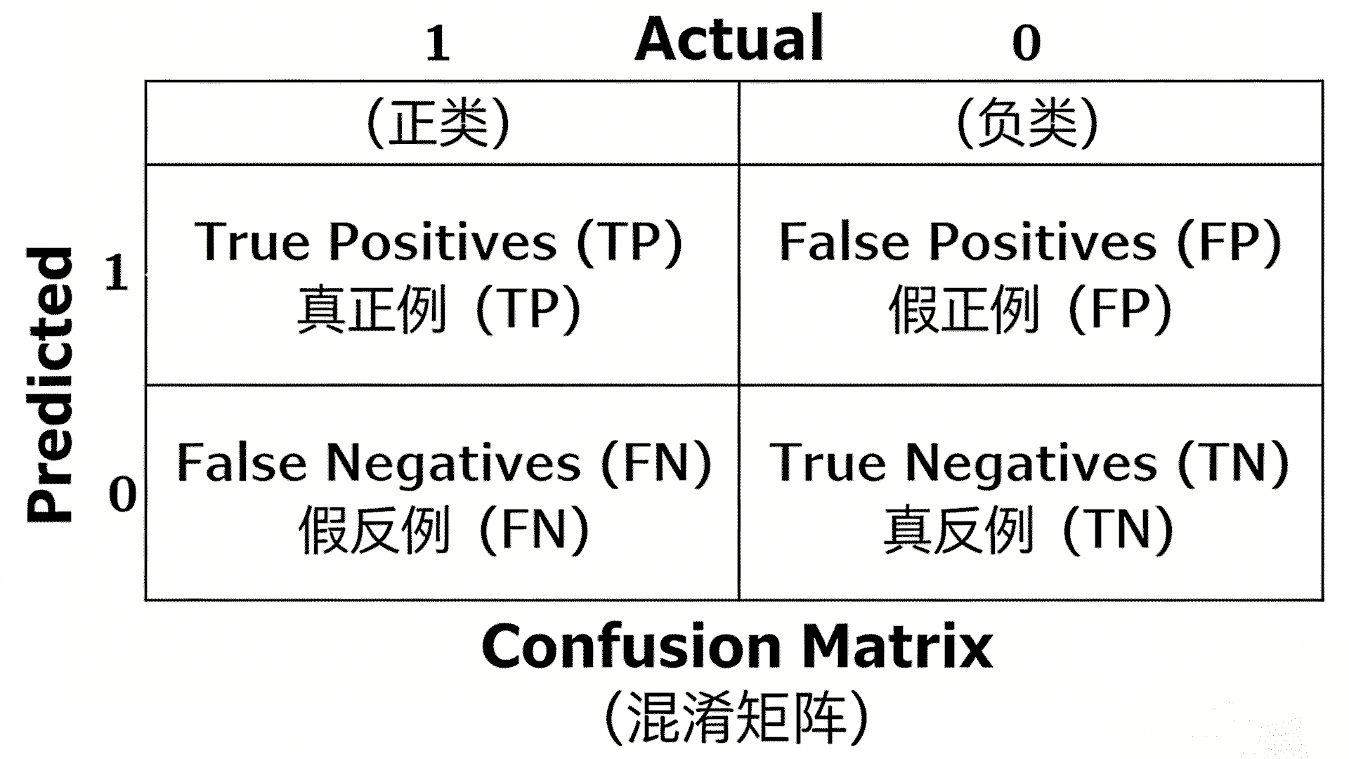 二分类问题的混淆矩阵结构(1为正类,0为负类):