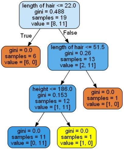 - 左子树(头发长度≤22.0cm):6个样本全为男性(基尼系数=0.0);