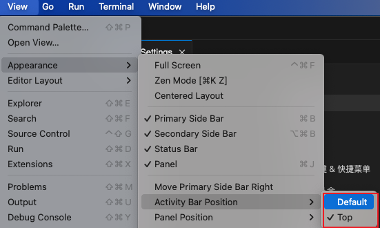 目前默认是放在顶部,如果您想要切换至侧边展示,只需在顶栏配置:外观 → 活动栏位置 → 默认。这样可以根据您的使用习惯自由调整界面布局。