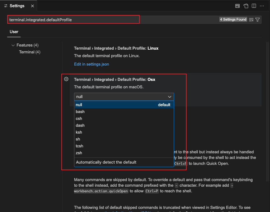 terminal.integrated.defaultProfile→ 设置所用 OS 的默认 Shell 为其他 Shell,例如 Bash → 重启 Meituan CatPaw),但是换 Shell 可能有环境变量缺失的风险(见下图)。