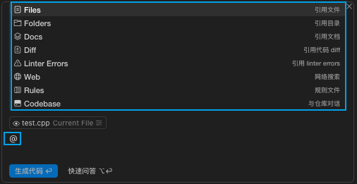 Inline Chat 同样支持 Codebase 索引和所有 @Symbols 功能,帮助 AI 更好地理解您的项目上下文。详细使用方法请参考上下文部分。