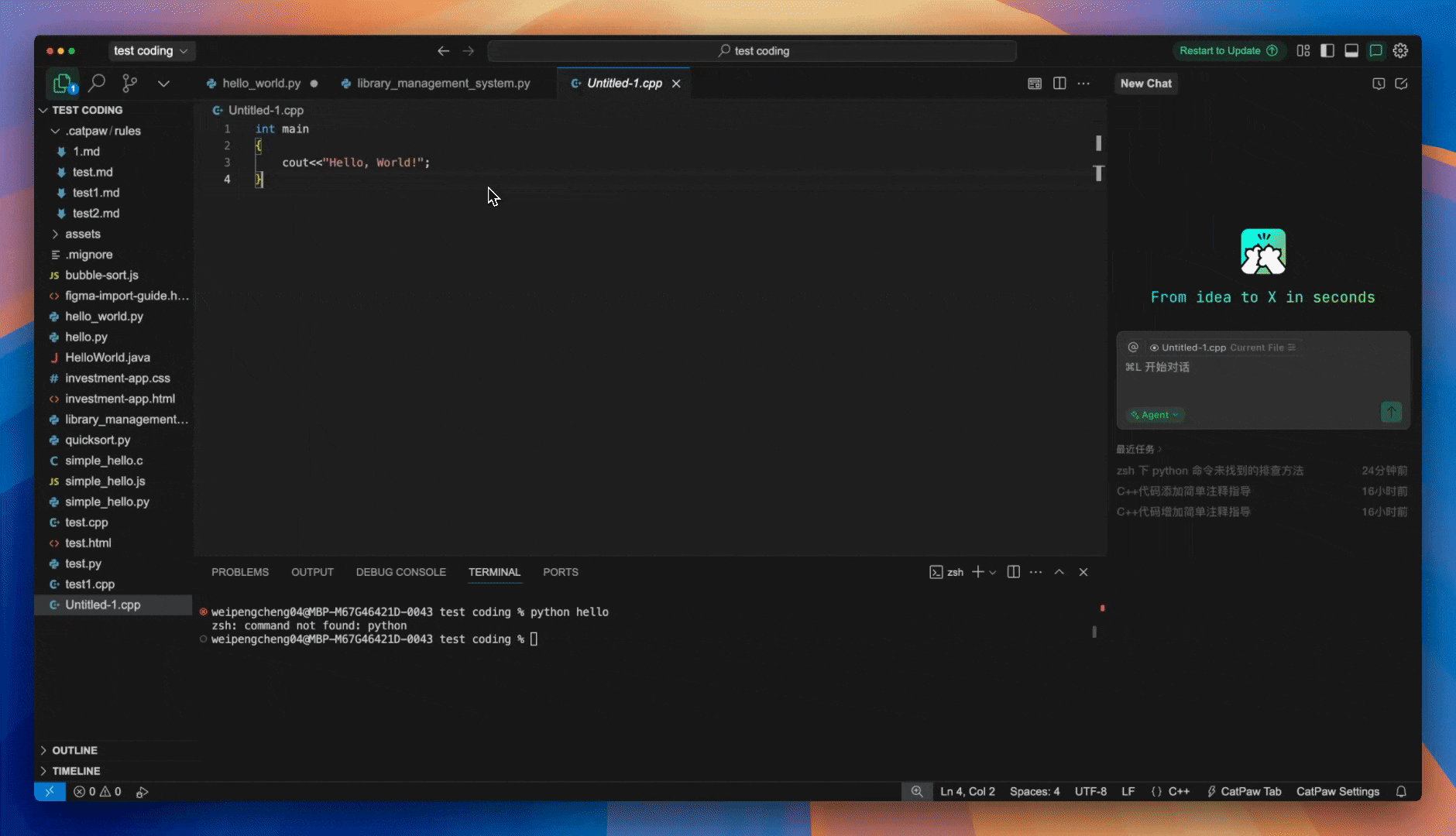 如果您需要修改现有代码,可以先选中目标代码段,然后执行 Cmd + I 操作。Meituan CatPaw 会根据您的具体需求对选中的代码进行智能修改。您可以利用这个功能进行代码风格调整、重构优化、性能提升、缺陷修复等各种代码改进操作。