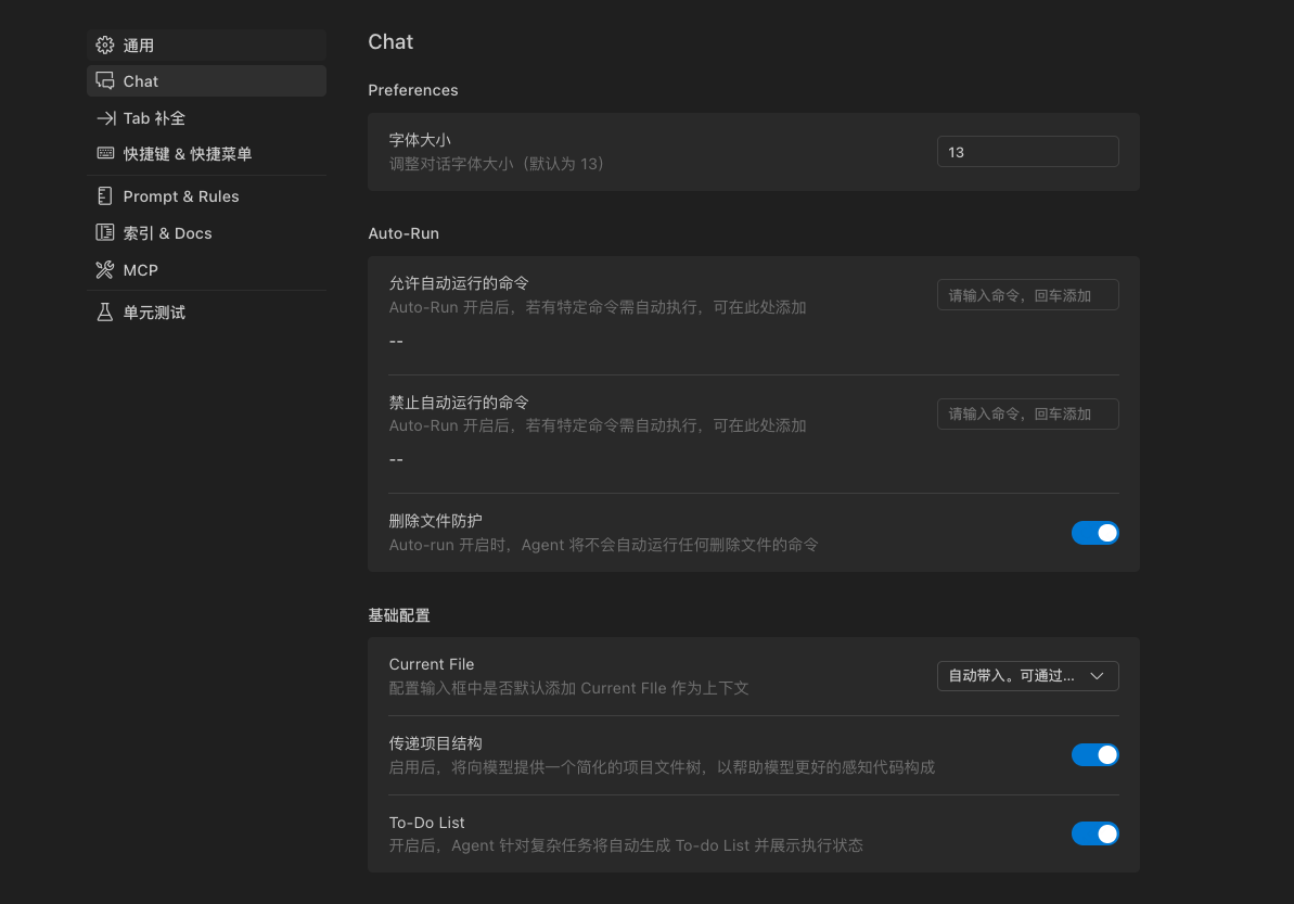 在 Meituan CatPaw 的 Chat 设置中,您可以根据个人偏好和工作需求,灵活配置各项功能参数,打造专属的 AI 编程助手体验。