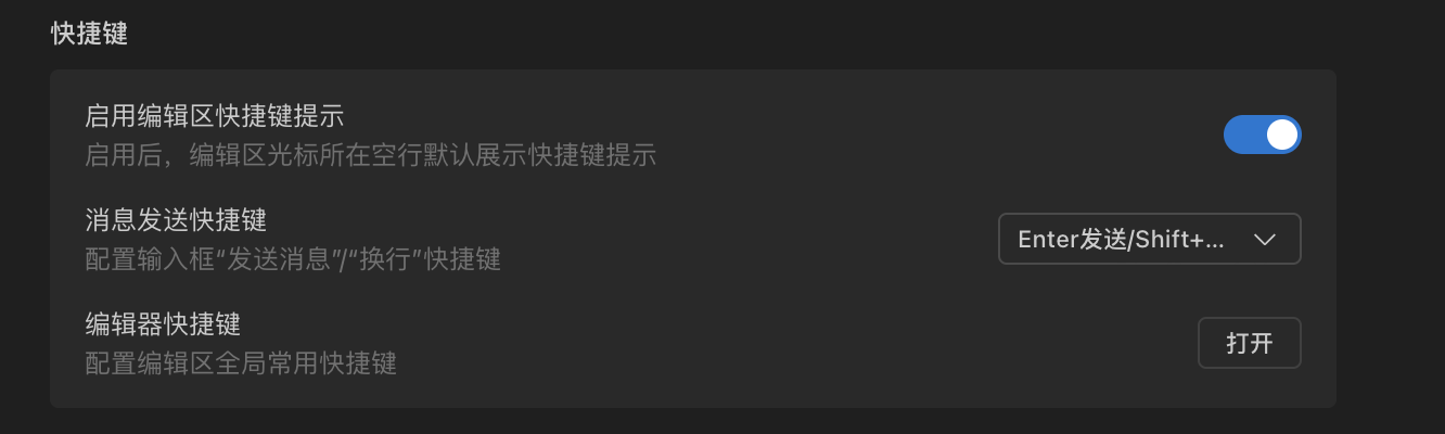 您可以根据个人习惯,自由选择 Enter 和 Shift + Enter 按键与换行、发送指令功能之间的对应关系。