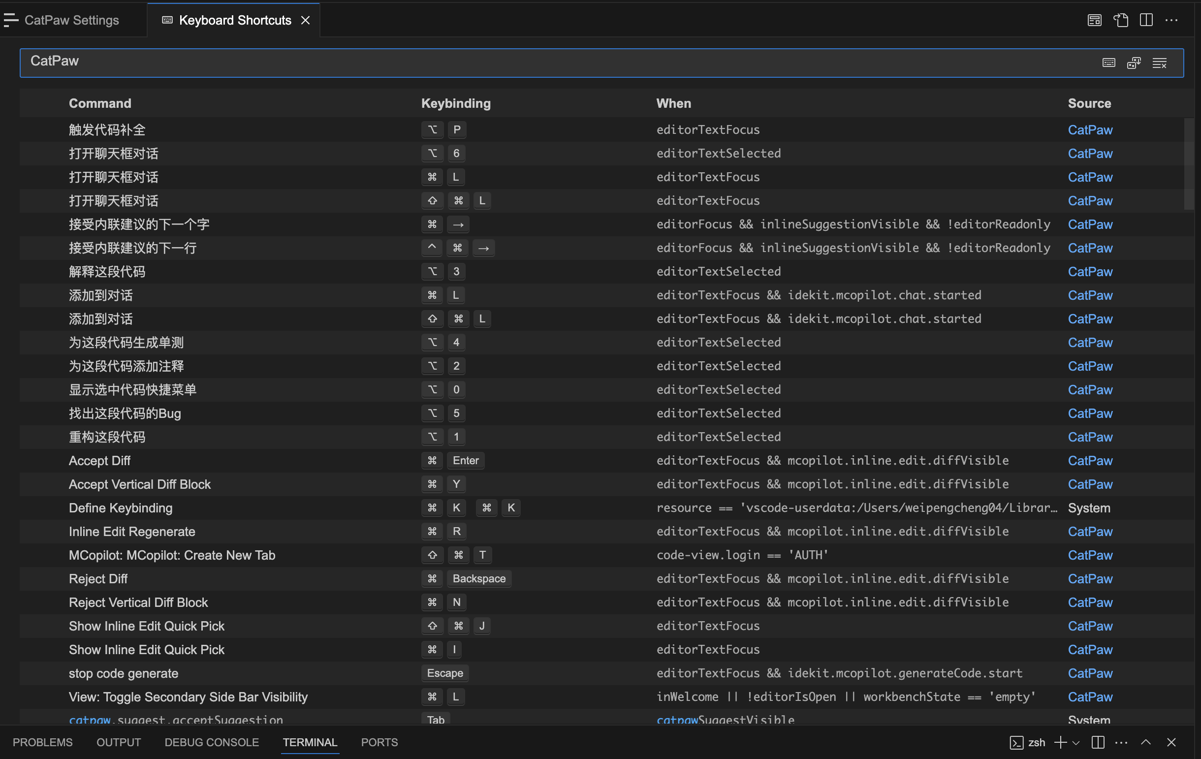 点击 编辑器快捷键 选项将跳转到 IDE 的快捷键设置界面。在顶部搜索框中输入 CatPaw,即可快速定位并自定义相关的快捷键绑定。