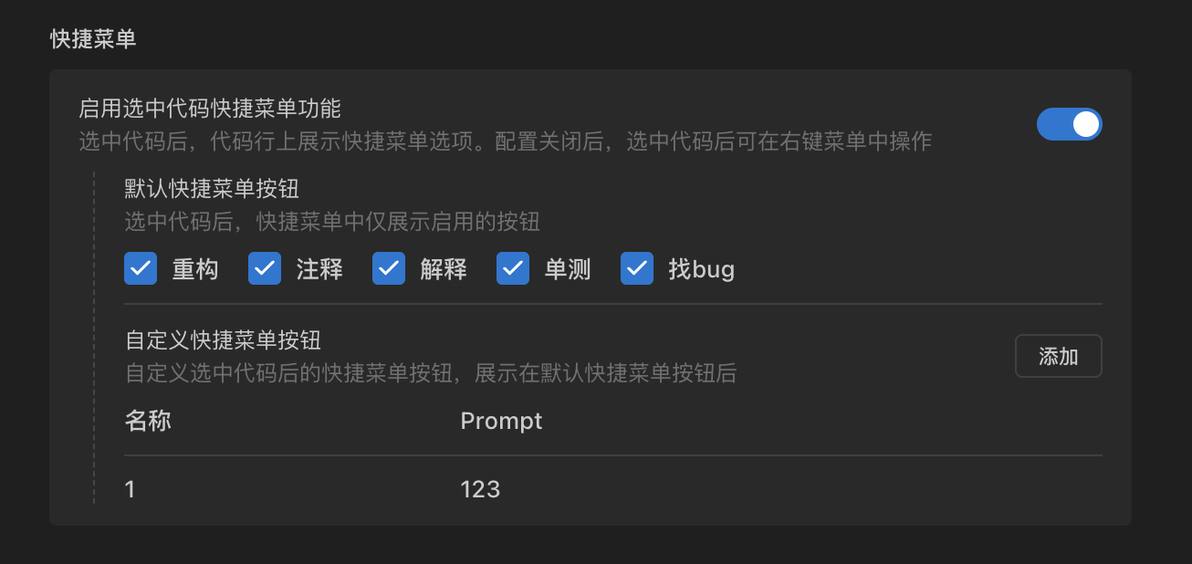 开启 启用选中代码快捷菜单功能 后,当您选中代码并点击 IDE 空白区域时,系统会自动弹出便捷的快捷菜单,可更方便的使用常用功能。