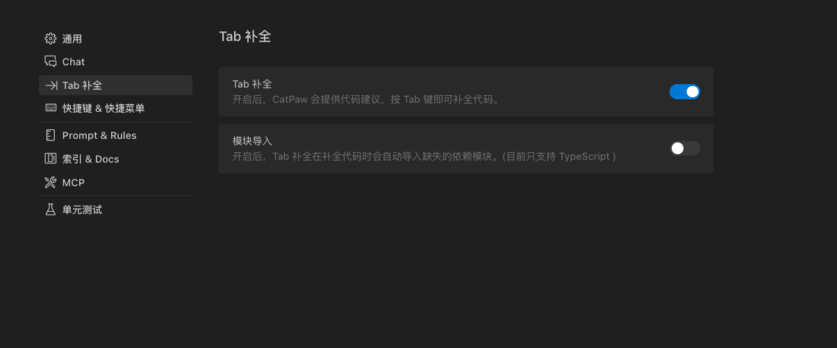 Meituan CatPaw 为您提供智能的 Tab 补全功能,让编程更加高效便捷。通过以下设置,您可以根据个人习惯定制最适合的代码补全体验。