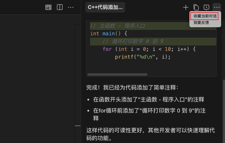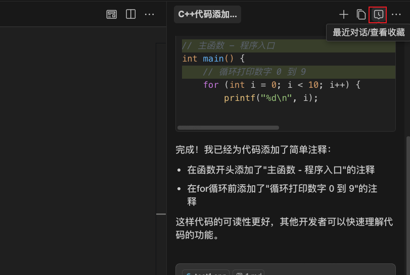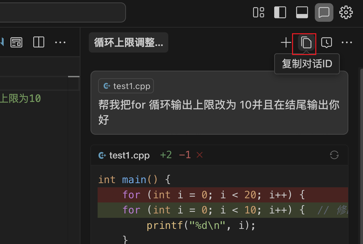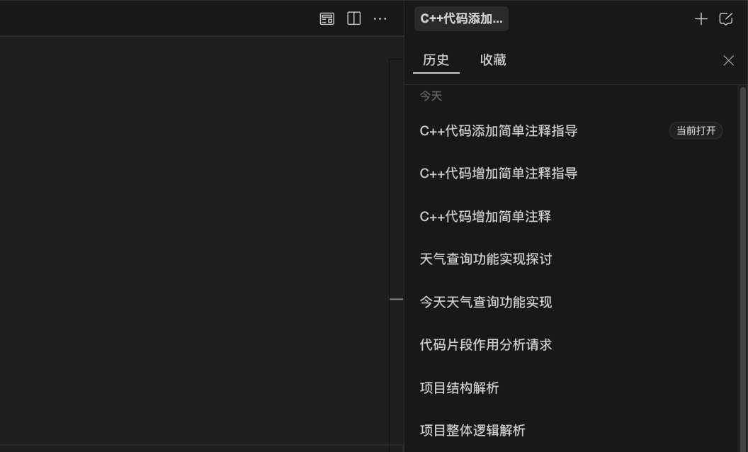 Meituan CatPaw 侧边栏对话中提供了收藏对话、查看历史对话和复制对话 ID 的功能,让您的使用更加便捷。