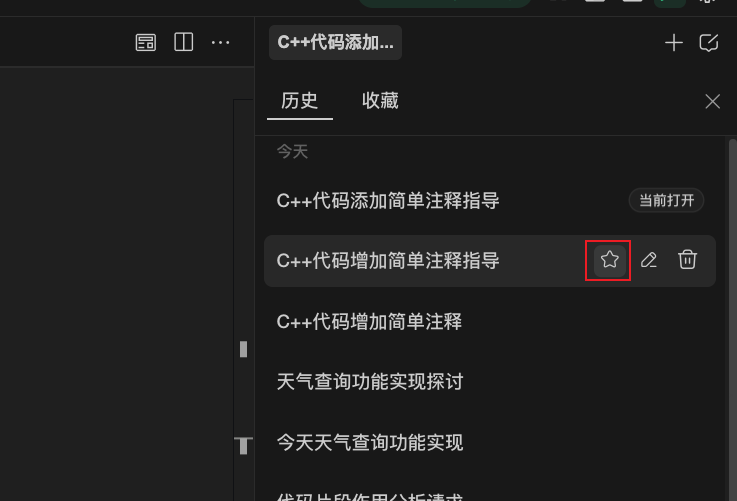 Meituan CatPaw 支持对正在进行的对话/历史对话进行收藏,点击对话右上角的"收藏当前对话"按钮或在历史对话记录中单击"收藏"按钮进行收藏。收藏的对话可在收藏列表中查看并在原对话基础上继续对话。