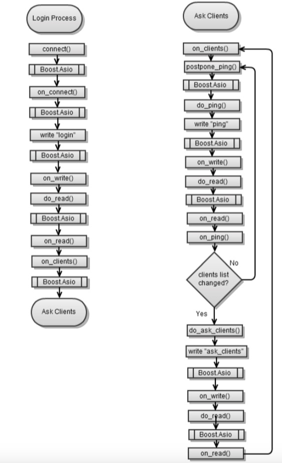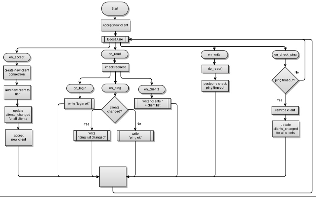 这个示意图是相当复杂的;从Boost.Asio出来你可以看到4个箭头指向on_accept,on_read,on_write和on_check_ping。这也就意味着你永远不知道哪个异步调用是下一个完成的调用,但是你可以确定的是它是这4个操作中的一个。