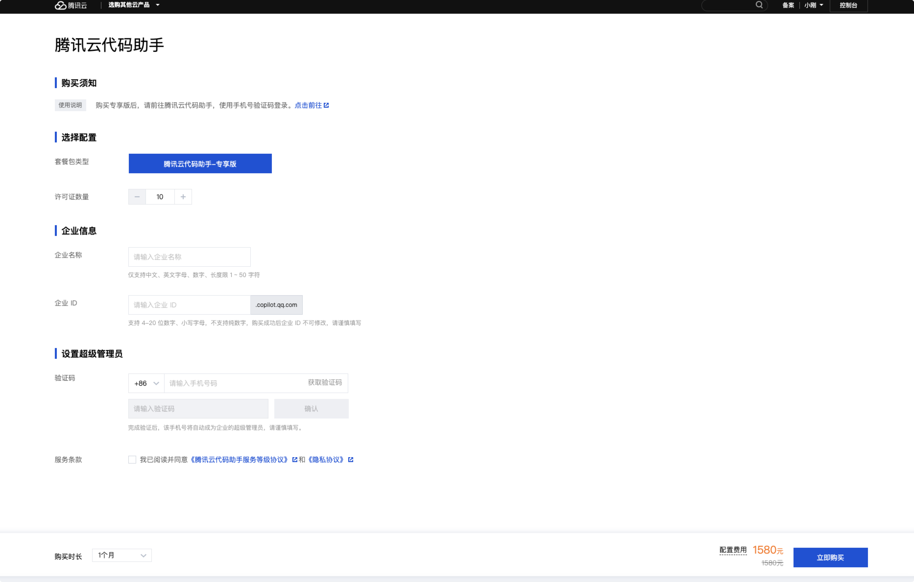 登录购买页,发起专享版企业新购,购买时输入企业名称、企业 ID、超管手机号。