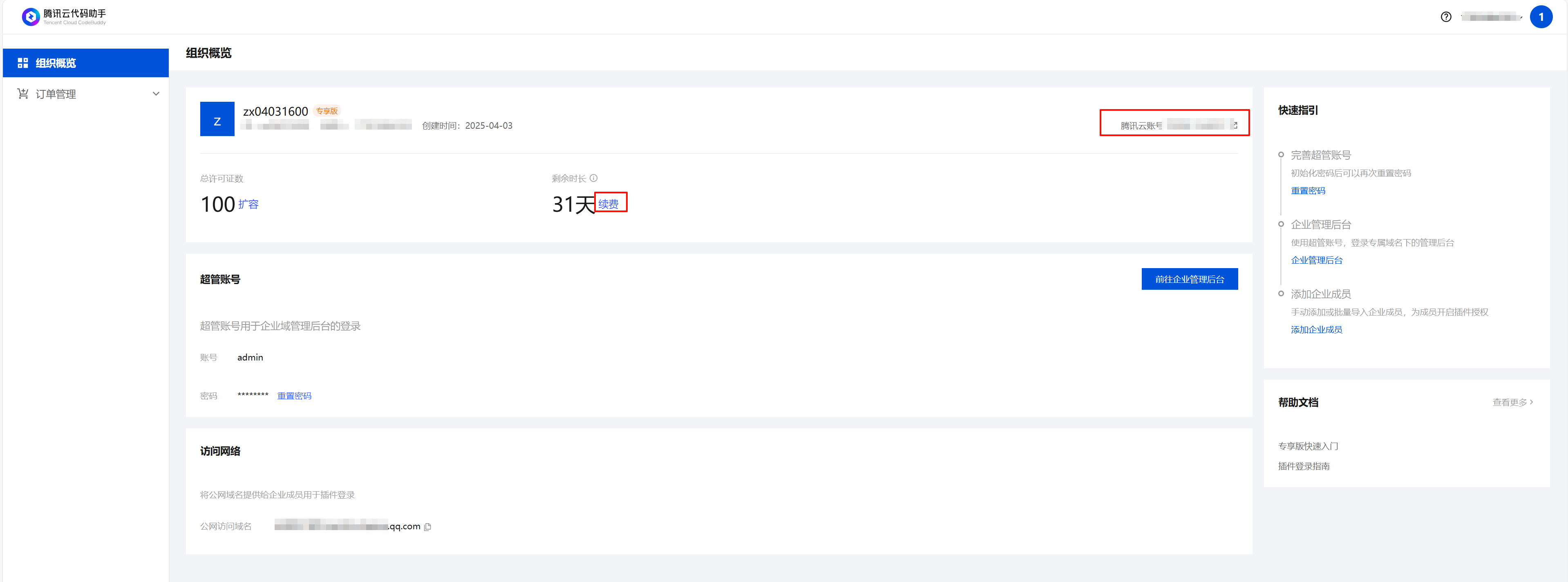 注意:请使用购买企业的腾讯云账号进行续费(在企业概览中可查看腾讯云账号 uin),若账号有误,请重新登录。