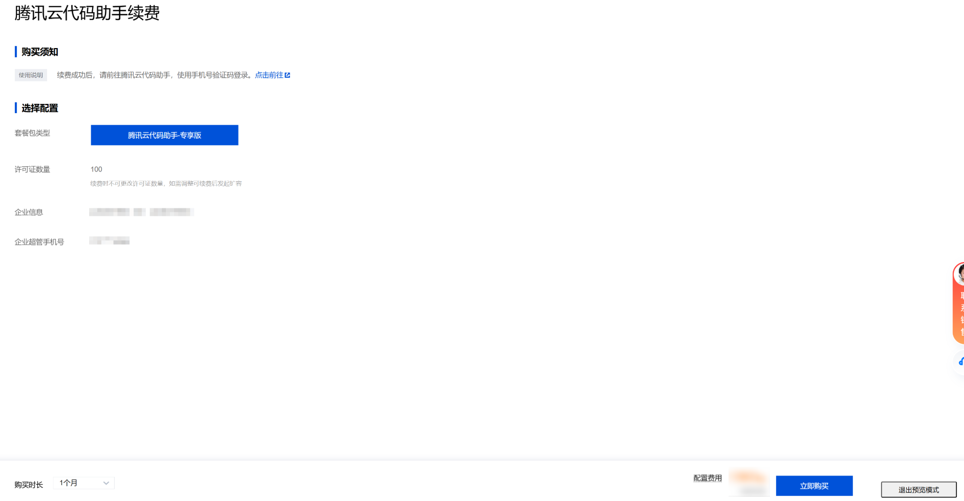 专享版用户在到期后未续费的情况下,将保留数据2周。 - 进入续费购买页,填写相关信息:选择续费时长,支持按月续费、按年续费。确认许可证数量,许可证数量在续费时不可改变,如需扩容可在续费完成后扩容,详情请参见 扩容说明。确认企业信息、企业超管手机号。