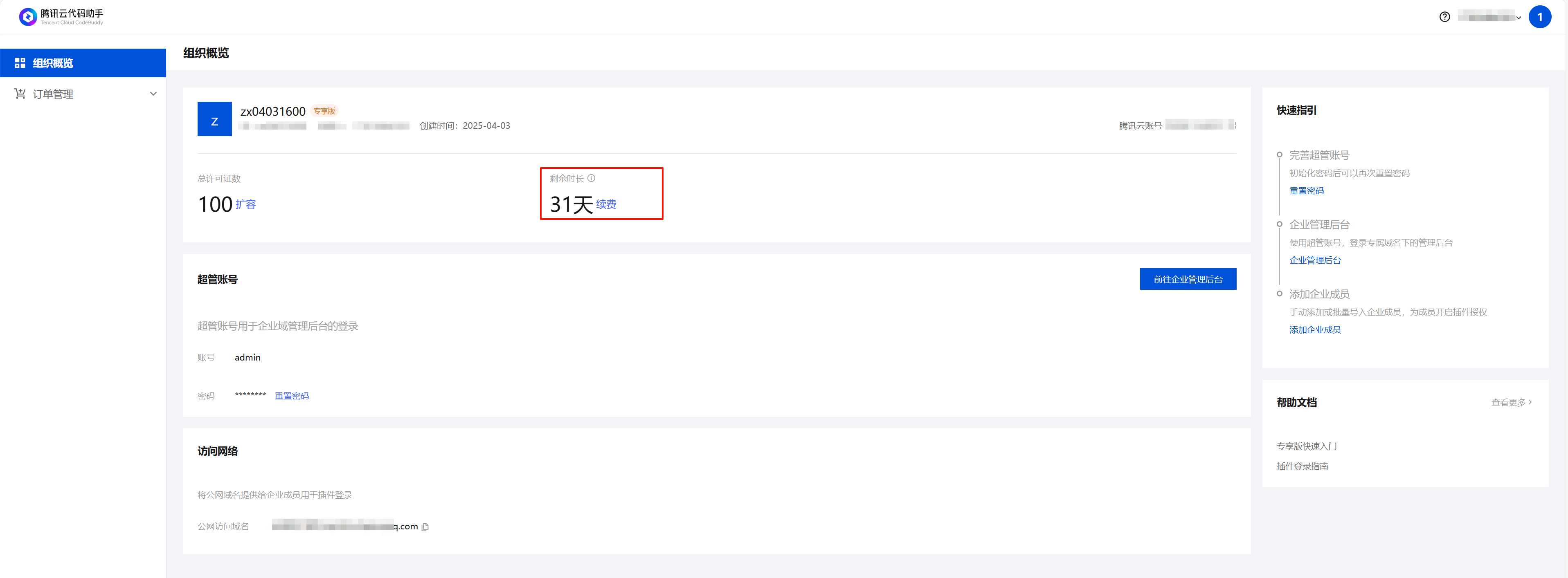 - 购买完成后,返回 企业后台,确认剩余时长是否正确增加。