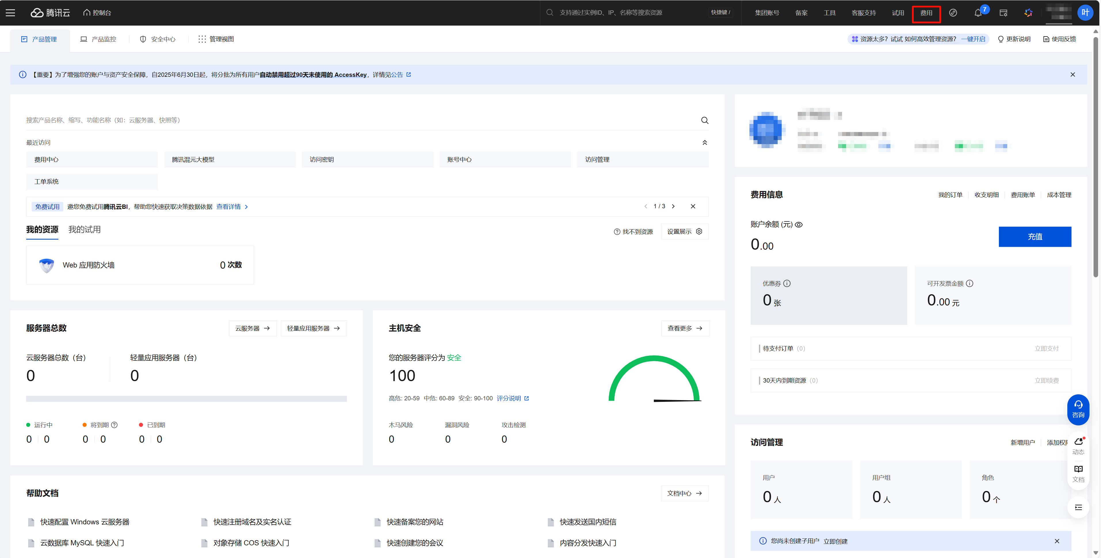 - 登录 腾讯云控制台,并单击费用,进入费用中心。