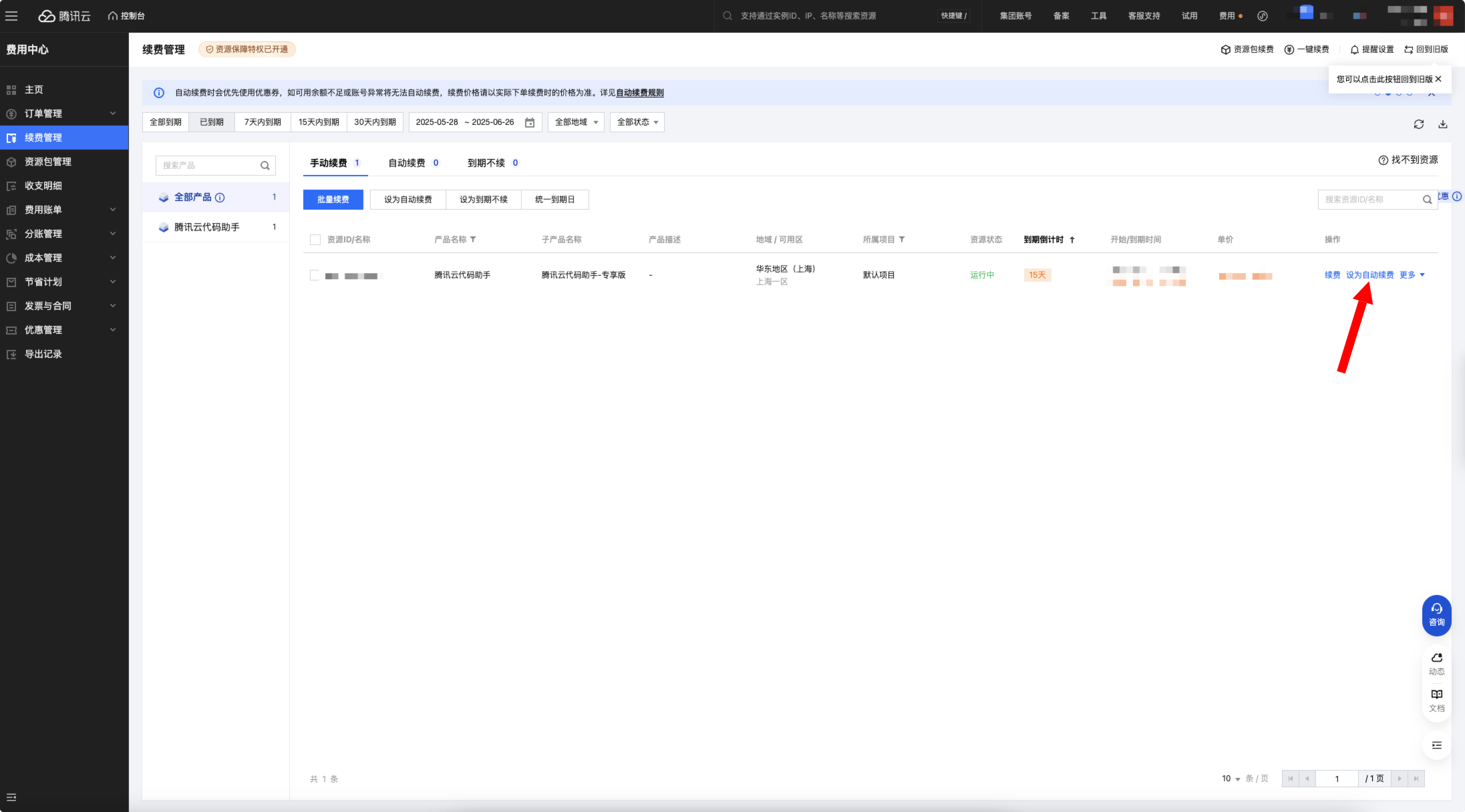 - 在续费管理页中,将手动续费设为自动续费。