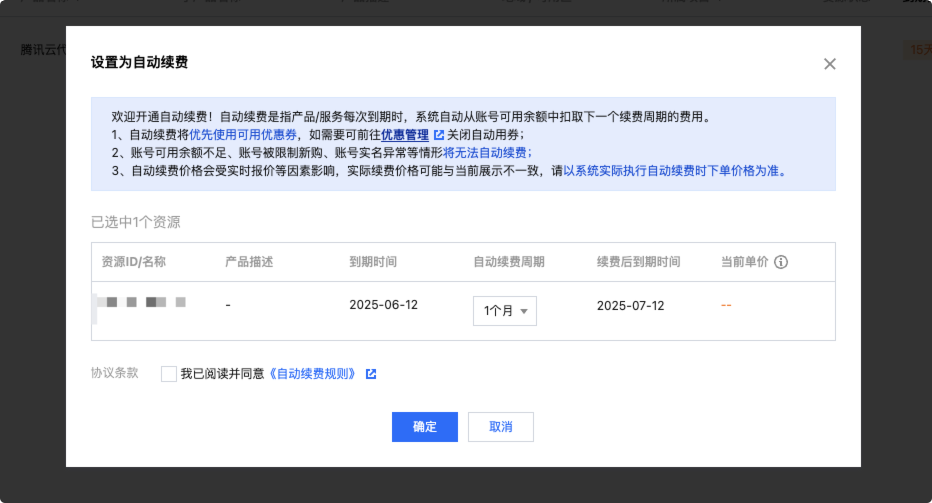 - 选择自动续费周期,勾选协议条款后单击确定即可。