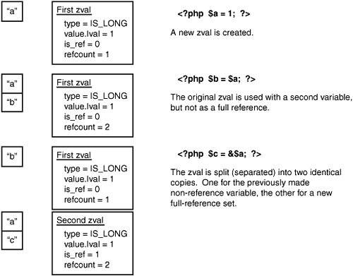 The answer is: 不可能!在这种情况下,变量的值必须分离成两份完全独立的存在!$a与$c共用一个zval,$b自己用一个zval,尽管他们拥有同样的值,但是必须至少通过两个zval来实现。见图3.2【在引用时强制复制!】