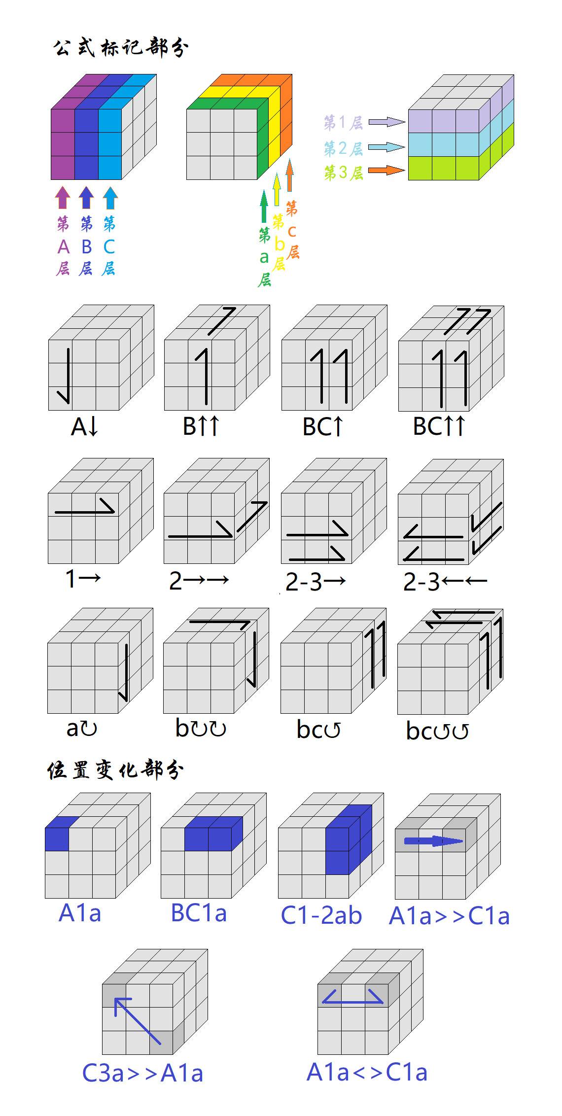 标记:大写字母与与↑、↓绑定,阿拉伯数字与←、→与绑定,小写字母与↻、↺绑定。如A↑表示第A层向上操作一次。2-3←表示第二、第三层同时向左操作一次。ac↻↻表示第a到第c层同时顺时针操作两次。