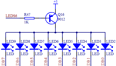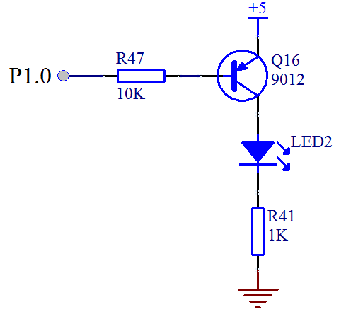 如果 P1.0 由我们的程序给一个高电平1,那么基极 b 和发射极 e 都是 5 V,也就是说 e 到 b 不会产生一个 0.7 V 的压降,这个时候,发射极和集电极也就不会导通,那么竖着看这个电路在三极管处是断开的,没有电流通过,LED2 小灯也就不会亮。如果程序给 P1.0 一个低电平0,这时 e 极还是 5 V,于是 e 和 b 之间产生了压差,三极管 e 和 b 之间也就导通了,三极管 e 和 b 之间大概有 0.7 V 的压降,那还有(5-0.7)V 的电压会在电阻 R47 上。这个时候,e 和 c 之间也会导通了,那么 LED 小灯本身有 2 V 的压降,三极管本身 e 和 c 之间大概有 0.2 V的压降,我们忽略不计。那么在 R41 上就会有大概 3 V 的压降,可以计算出来,这条支路的电流大概是 3 mA,可以成功点亮 LED。