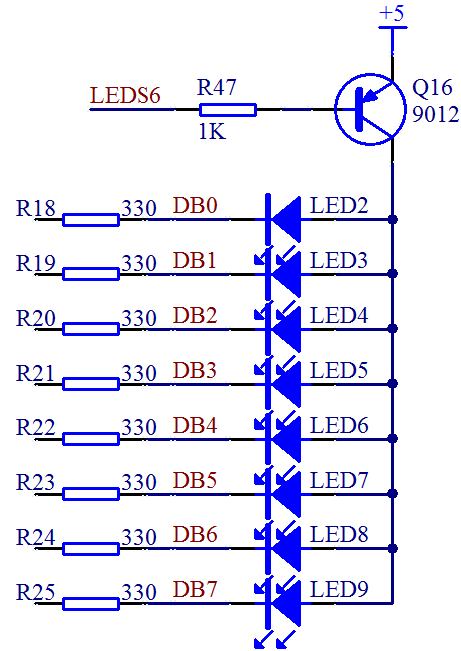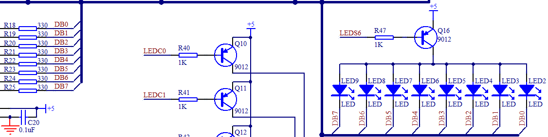 这里我们要学会看电路图的一个知识点,电路图右侧所有的 LED 下侧的线最终都连到一根黑色的粗线上去了,大家注意,这个地方不是实际的完全连到一起,而是一种总线的画法,画了这种线以后,表示这是个总线结构。而所有的名字一样的节点是一一对应的连接到一起,其他名字不一样的,是不连在一起的。比如左侧的 DB0 和右侧的最右边的 LED2 小灯下边的 DB0 是连在一起的,而和 DB1 等其他线不是连在一起的。