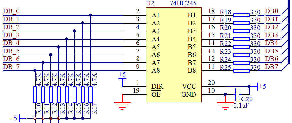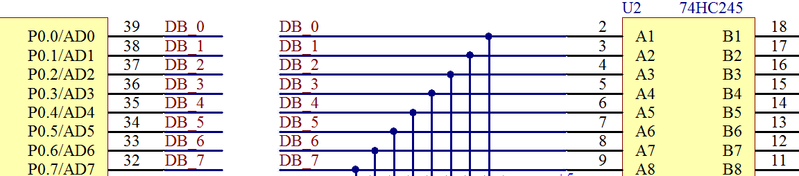 还有最后一个使能引脚19脚 OE,叫做输出使能,这个引脚上边有一横,表明是低电平有效,当接了低电平后,74HC245 就会按照刚才上边说的起到双向缓冲器的作用,如果 OE接了高电平,那么无论 DIR 怎么接,A 和 B 的引脚是没有关系的,也就是 74HC245 功能不能实现出来。