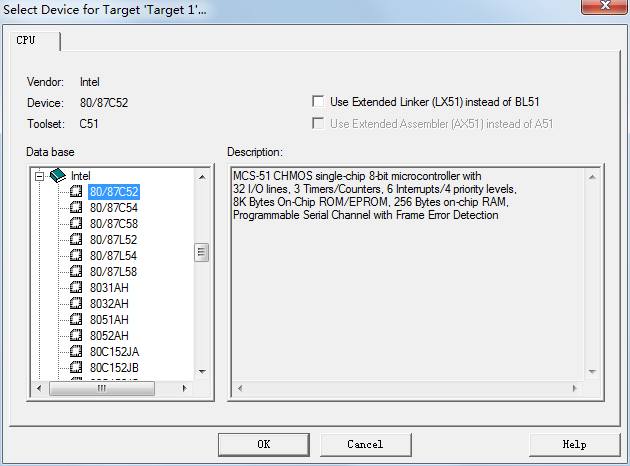 保存之后会弹出一个对话框,这个对话框让我们选择单片机型号。因为 Keil 软件是外国人开发的,所以我们国内的 STC89C52 并没有上榜,但是只要选择同类型号就可以了。因为51内核是由 Intel 公司创造的,所以这里我们直接选择 Intel 公司名下的 80/87C52 来代替,这个选项的选择对于后边的编程没有任何的不良影响。如图2-10所示。