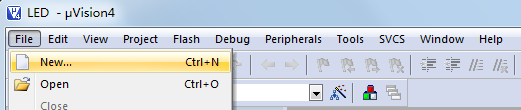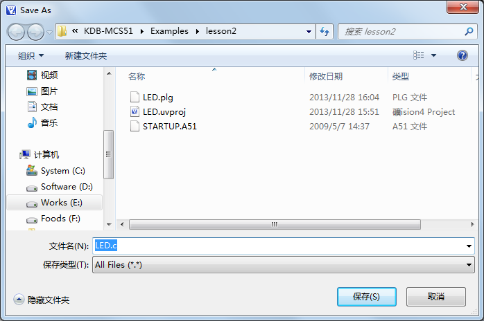 工程有了之后,我们要建立编写代码的文件,点击 File-->New,如图2-13,新建一个文件,也就是我们编写程序的平台。然后点 File-->Save 或者直接点击那个 Save 的快捷键,可以保存文件,保存时我们把它命名为 LED.c,这个地方必须加上 .c,因为如果写汇编语言,这个地方的扩展名是 .asm,头文件就是 .h 等等,我们编写的是 C 语言程序,这个地方必须自己添加文件的扩展名 .c,如图2-14所示。