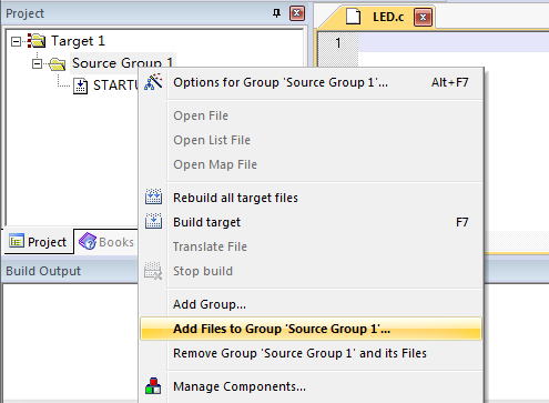 现在我们就可以在我们建立好的文件中输入我们的程序代码了,在编写之前还有个工作要做。我们每做一个功能程序,必须要新建一个工程,一个工程代表了单片机要实现的一个功能。但是一个工程,有时候我们可以把我们的程序分多个文件写,所以每写一个文件,我们都要添加到我们所建立的工程中去,鼠标右键点 Source Group 1,点 Add Files to Group„Source Group 1‟...,如图 2-15所示。