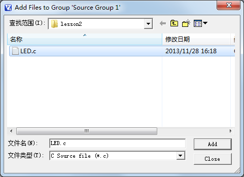 在弹出的对话框中,单击 LED.c 选中它,然后点 Add,或者直接双击 LED.c 都可以将文件加入到这个工程下,然后单击 Close,关闭添加。这个时候大家会看到在 Source Group 1下边又多了一个 LED.c 文件。