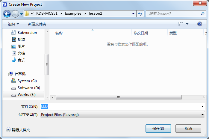我们直接点保存就可以了,工程会自动保存成 LED.uvproj 文件,下次要打开 LED 这个工程时,可以直接找到文件夹,双击这个 .uvproj 文件就可以直接打开了。