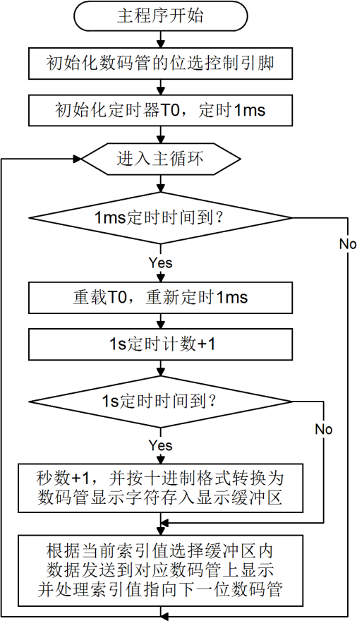 我们的目标还是实现秒表功能,只不过这次有6个位了,最大可以计到999999秒。那么现在要实现的这个程序相对于前几章的例程来说就要复杂的多了,既要处理秒表计数,又要处理动态扫描。在编写这类稍复杂的程序时,建议初学者们先用程序流程图来把程序的整个流程理清,在动手写程序之前先把整个程序的结构框架搭好,把每一个环节要实现的功能先细化出来,然后再用程序代码一步一步的去实现出来。这样就可以避免无处下笔的迷茫感了。如图6-1就是本例的程序流程图,大家先根据流程图把程序的执行经过在大脑里走一遍,然后再看接下来的程序代码,体会一下流程图的作用,看是不是能帮助你更顺畅的理清程序流程。