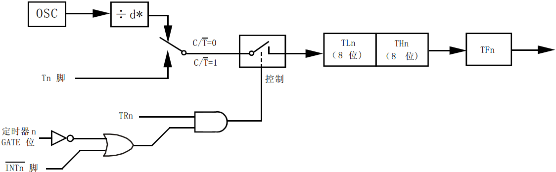 | 0 | 1 | 1 | THn 和 TLn 组成一个16位的定时器。 |