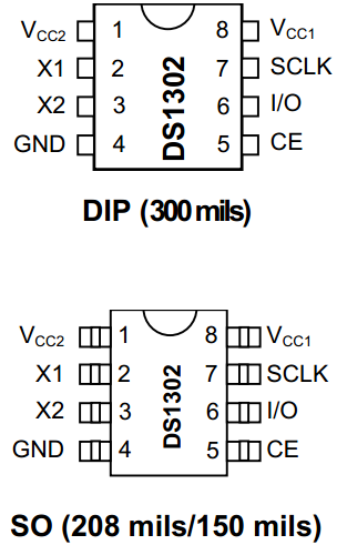 6)DS1302 共有8个引脚,有两种封装形式,一种是 DIP-8 封装,芯片宽度(不含引脚)是 300mil,一种是 SOP-8 封装,有两种宽度,一种是 150 mil,一种是 208 mil。我们看一下DS1302 的引脚封装图,如图15-3所示。