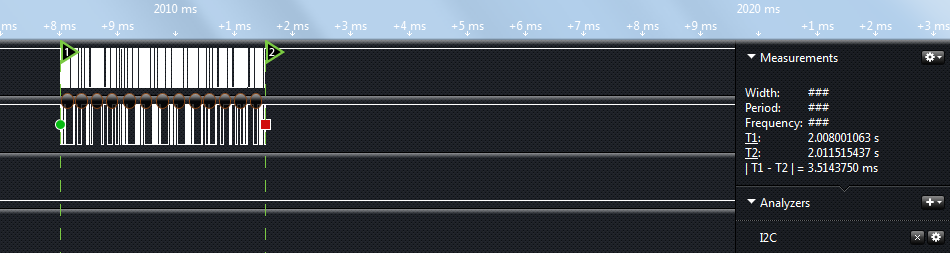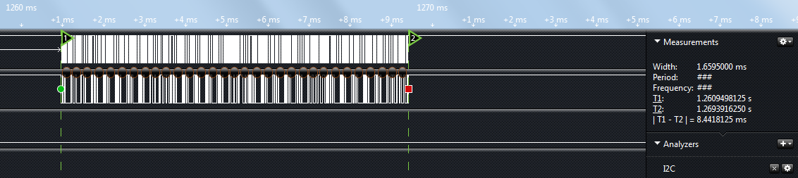 多字节写入和页写入程序都编写出来了,而且页写入的程序我们还特地跨页写的数据,它们的写入时间到底差别多大呢。我们用一些工具可以测量一下,比如示波器,逻辑分析仪等工具。我现在把两次写入时间用逻辑分析仪给抓了出来,并且用时间标签 T1 和 T2 标注了开始位置和结束位置,如图14-5和图14-6所示,右侧显示的|T1-T2|就是最终写入5个字节所耗费的时间。多字节一个一个写入,每次写入后都需要再次通信检测 EEPROM 是否在“忙”,因此耗费了大量的时间,同样的写入5个字节的数据,一个一个写入用了 8.4 ms 左右的时间,而使用页写入,只用了 3.5 ms 左右的时间。