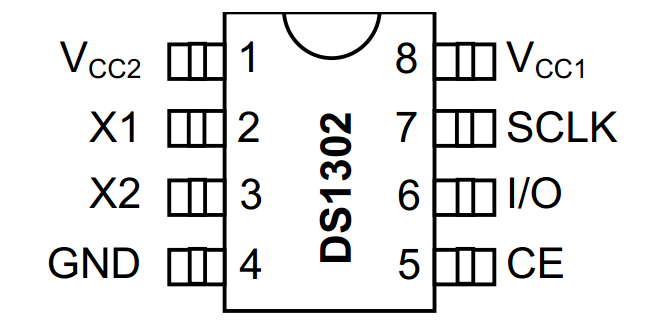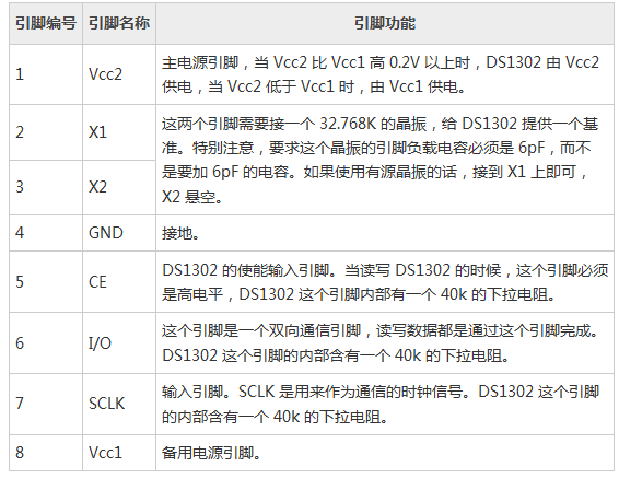 DS1302 一共有8个引脚,下边要根据引脚分布图和典型电路图来介绍一下每个引脚的功能,如图15-5和图15-6所示。