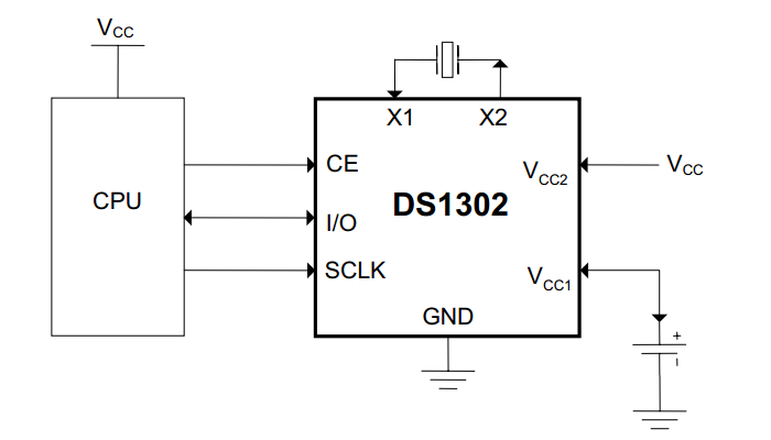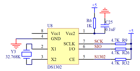 DS1302 电路的一个重点就是晶振电路,它所使用的晶振是一个 32.768 k 的晶振,晶振外部也不需要额外添加其它的电容或者电阻了。时钟的精度,首先取决于晶振的精度以及晶振的引脚负载电容。如果晶振不准或者负载电容过大或过小,都会导致时钟误差过大。在这一切都搞定后,最终一个考虑因素是晶振的温漂。随着温度的变化,晶振的精度也会发生变化,因此,在实际的系统中,其中一种方法就是经常校对。比如我们所用的电脑的时钟,通常我们会设置一个选项“将计算机设置与 internet 时间同步”。选中这个选项后,一般过一段时间,我们的计算机就会和 internet 时间校准同步一次。