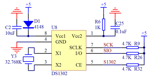 涓流充电功能,基本也用不到,因为实际应用中很少会选择可充电电池作为备用电源,成本太高,本课程也不讲了,大家作为选学即可。我们使用的时候直接用 5 V 电源接一个二极管,在主电源上电的情况下给电容充电,在主电源掉电的情况下,二极管可以防止电容向主电路放电,而仅用来维持 DS1302 的供电,这种电路的最大用处是在电池供电系统中更换主电池的时候保持实时时钟的运行不中断,1分钟的时间对于更换电池足够了。此外,通过我们的使用经验,在 DS1302 的主电源引脚串联一个 1 K 电阻可以有效的防止电源对 DS1302 的冲击,R6 就是这个电阻,而 R9、R26、R32 都是上拉电阻。