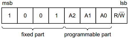 PCF8591 的通信接口是 I2C,那么编程肯定是要符合这个协议的。单片机对 PCF8591 进行初始化,一共发送三个字节即可。第一个字节,和 EEPROM 类似,是器件地址字节,其中7位代表地址,1位代表读写方向。地址高4位固定是 0b1001,低三位是 A2,A1,A0,这三位我们电路上都接了 GND,因此也就是 0b000,如图17-5所示。