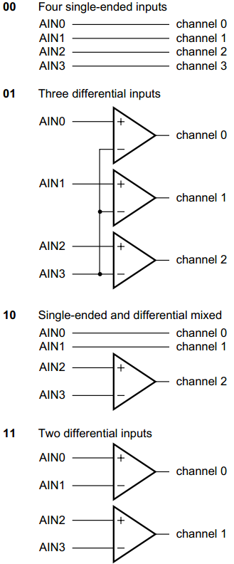 控制字节的第6位是 DA 使能位,这一位置1表示 DA 输出引脚使能,会产生模拟电压输出功能。第4位和第5位可以实现把 PCF8591 的4路模拟输入配置成单端模式和差分模式,单端模式和差分模式的区别,我们在17.5节有介绍,这里大家只需要知道这两位是配置 AD 输入方式的控制位即可,如图17-7所示。