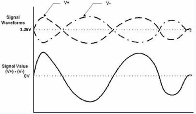 通常情况下,差分输入的中线是基准电压的一半,我们的基准电压是 2.5 V,假如 1.25 V 作为中线,V+ 是 AIN0 的输入波形,V- 是 AIN1 的输入波形,Signal Value 就是经过减法器后的波形。很多 A/D 都采用差分的方式输入,因为差分输入方式比单端输入来说,有更强的抗干扰能力。