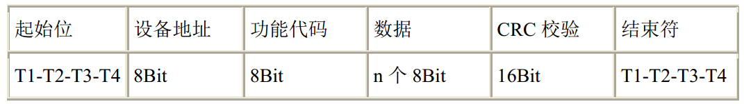 起始位和结束符:图18-5上代表的是一个数据帧,前后都至少有3.5个字节的时间间隔,起始位和结束符实际上没有任何数据,T1-T2-T3-T4 代表的是时间间隔3.5个字节以上的时间,而真正有意义的第一个字节是设备地址。