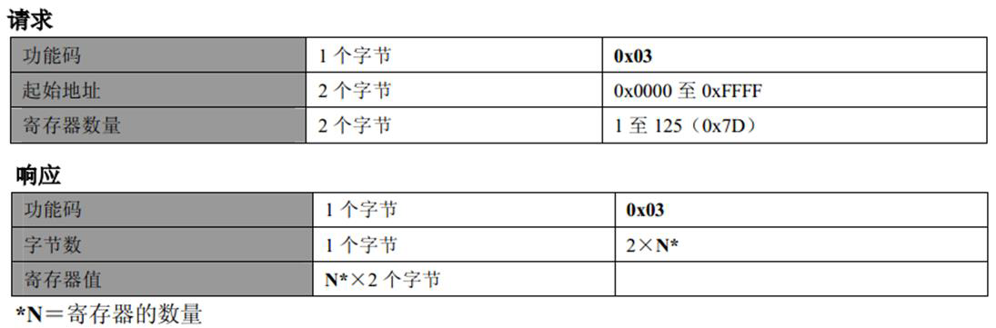 | 03 | 读取保持寄存器 | 在一个或多个保持寄存器中取得当前的二进制值 |