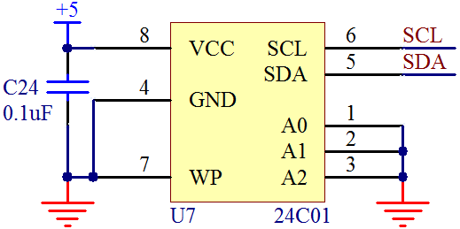 我们板子上的 EEPROM 器件型号是 24C02,在 24C02 的数据手册3.6节中可查到,24C02 的7位地址中,其中高4位是固定的 0b1010,而低3位的地址取决于具体电路的设计,由芯片上的 A2、A1、A0 这3个引脚的实际电平决定,来看一下我们的 24C02 的电路图,它和 24C01 的原理图完全一样,如图14-4所示。